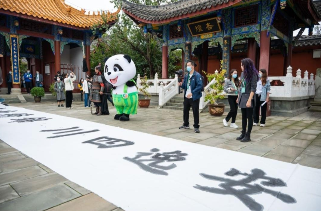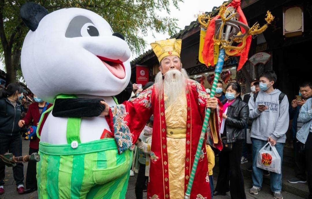 11月9日下午,2022四川省文化和旅游发展大会召开前一天,安逸熊猫阆中线下主题活动举行。活泼可爱的四川文旅吉祥物“安逸”熊猫,在“张飞”和“春节老人”陪伴下,沉浸式巡游阆中古城。