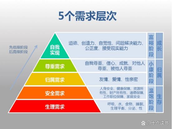 心理学家马斯洛将人的需求分为五个层次,依次是生理需要、安全需要、归属和爱的需要、尊重的需要和自我实现。