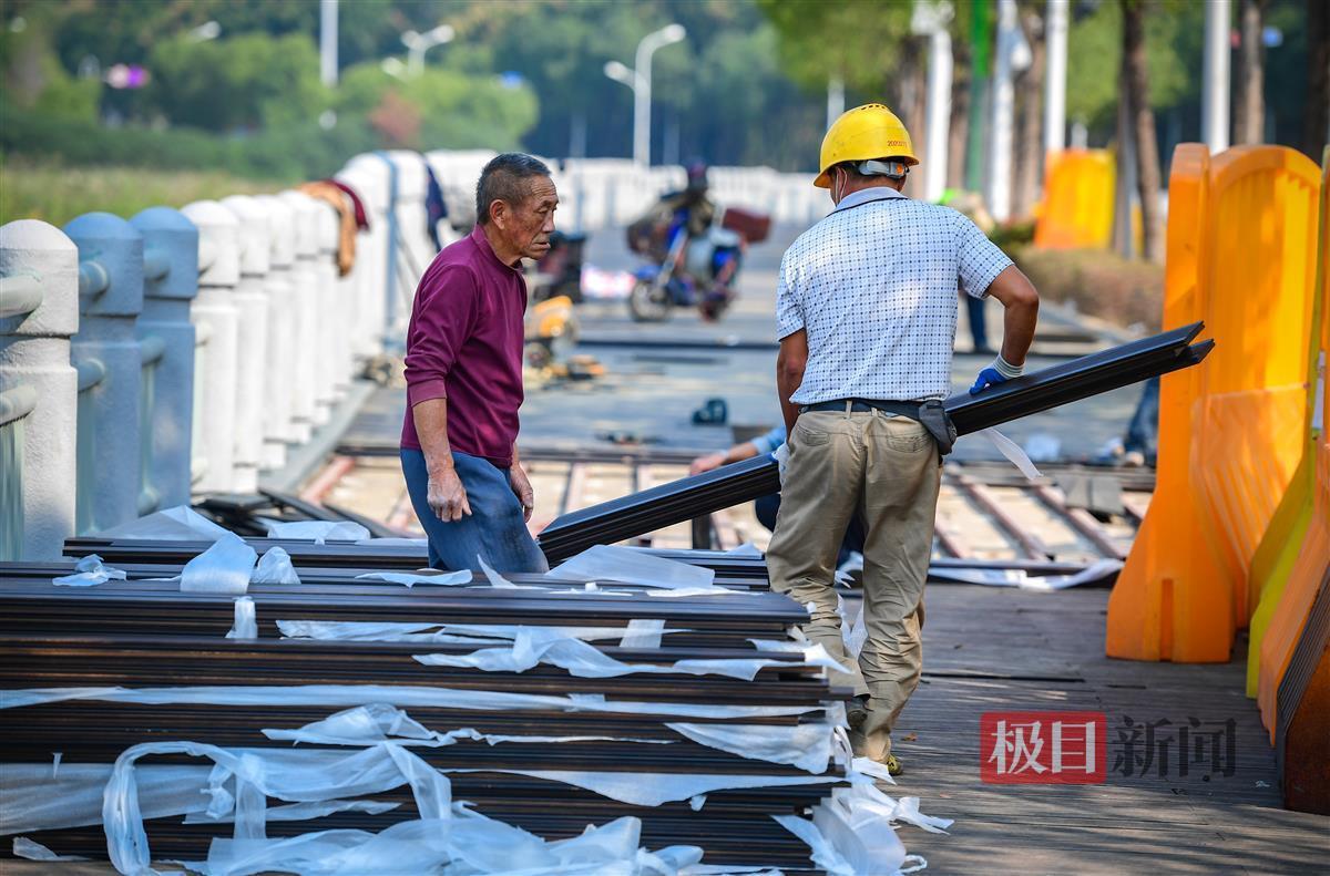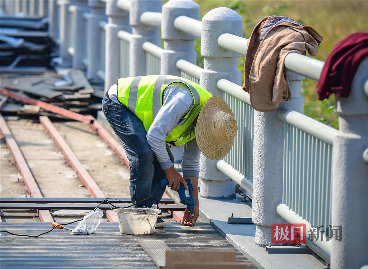 11月9日上午,武昌沙湖大道人行栈道已搭成黄色围挡,进行大规模维修。记者现场看到,工人师傅对栈道上的地板进行更换,清除之前的腐烂或破损地板,再安装上新的地板。