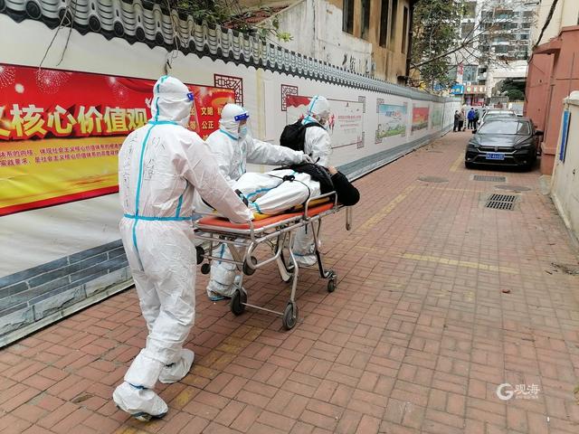 张鉴再次和求助人对接,得知患者体重在200斤左右且行动不便,而救护车只有一名驾驶员,且只能停在临邑路上,距其住所有一段34级的台阶。面对这一情况,张鉴找来同在管区开展志愿服务的同事孙准和唐涛,待救护车到来后,拿着担架赶往患者的楼栋。当患者坐着轮椅来到楼栋门口后,张鉴拿出防护服让家属帮其穿好,随后便让其躺在担架上。