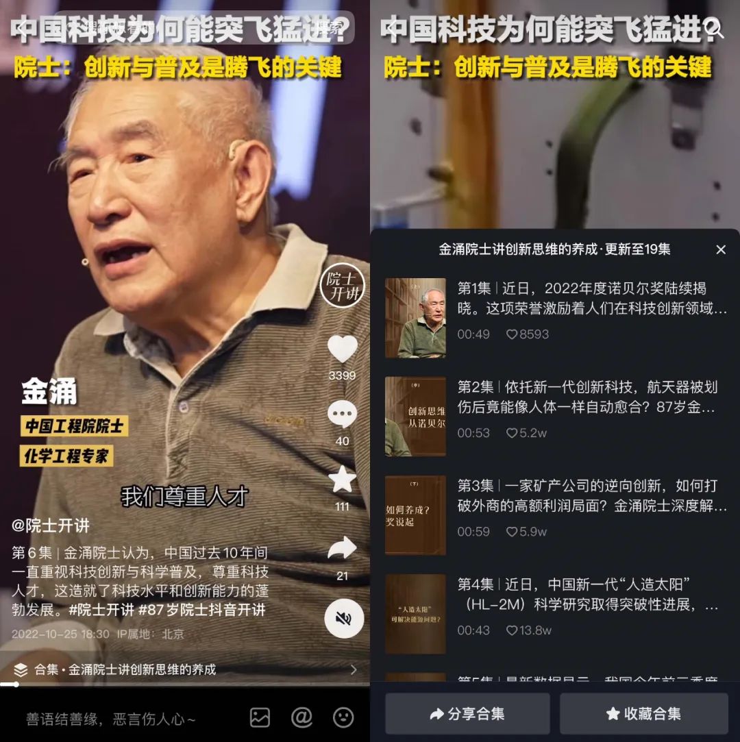 中国科协联合抖音推出了《科创中国·院士开讲》,目前已经推出了两季内容。杜祥琬、龙乐豪、王玉明、邬贺铨、汪懋华等重量级院士领衔开讲,研究方向涵盖能源战略、运载火箭、机械设计、通信技术,以及农业工程等。