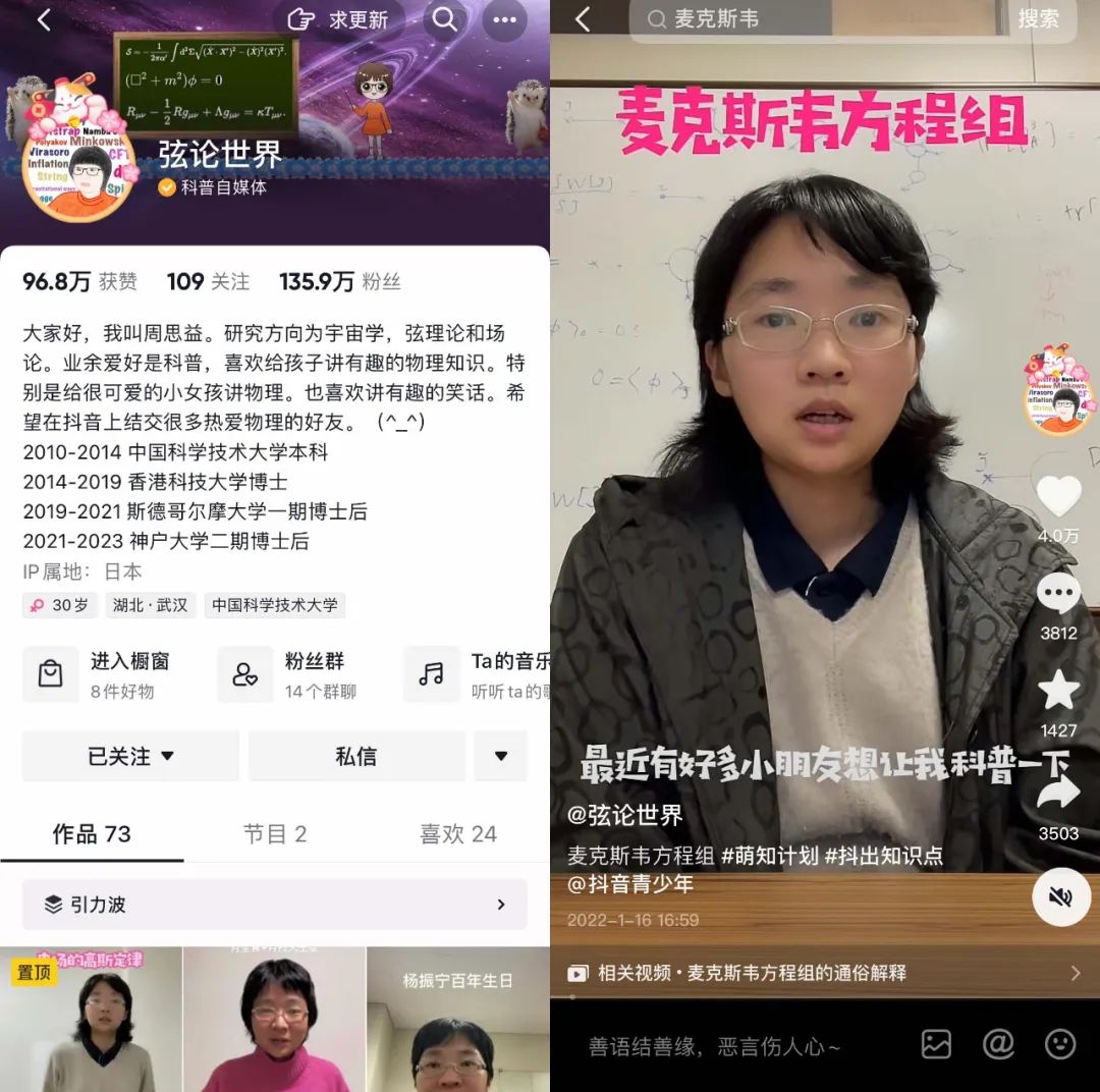 还有凭借#人类可能可以穿越到未来 冲上热榜的 90 后物理学博士后周思益。她刚刚在中科院物理所联合抖音的《科学 1 小时》直播中亮相,讲述了人类未来的发展。
