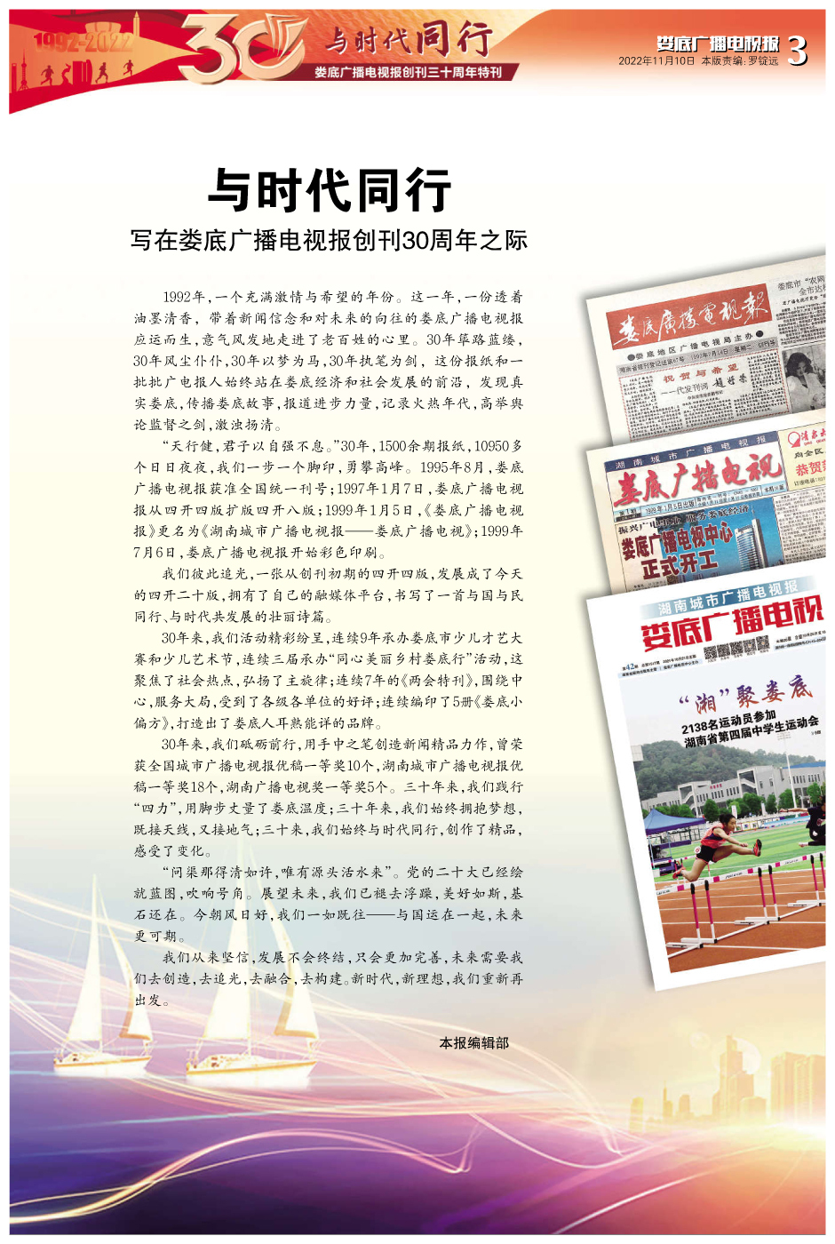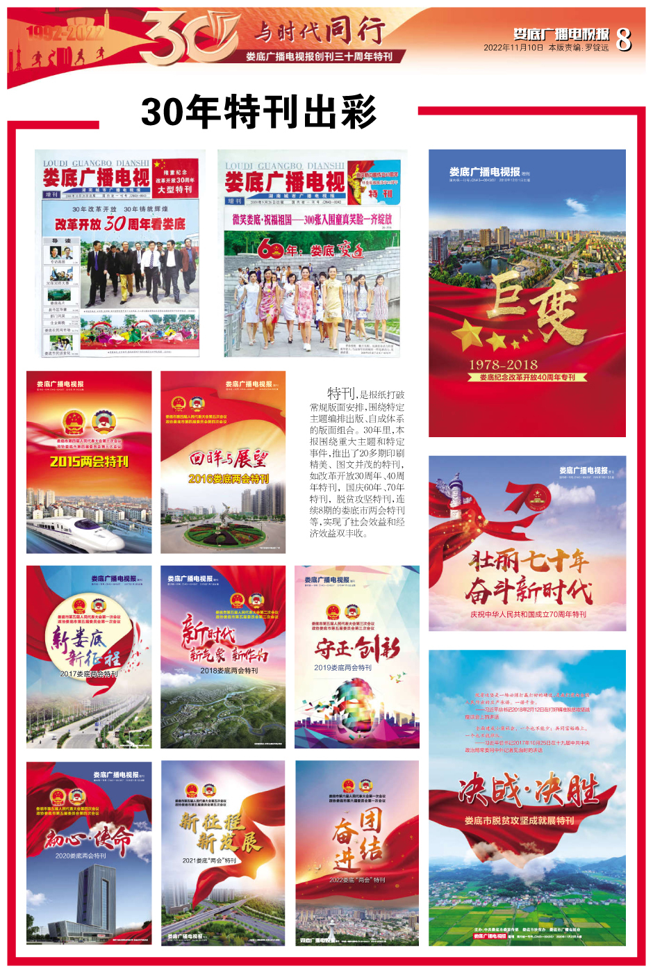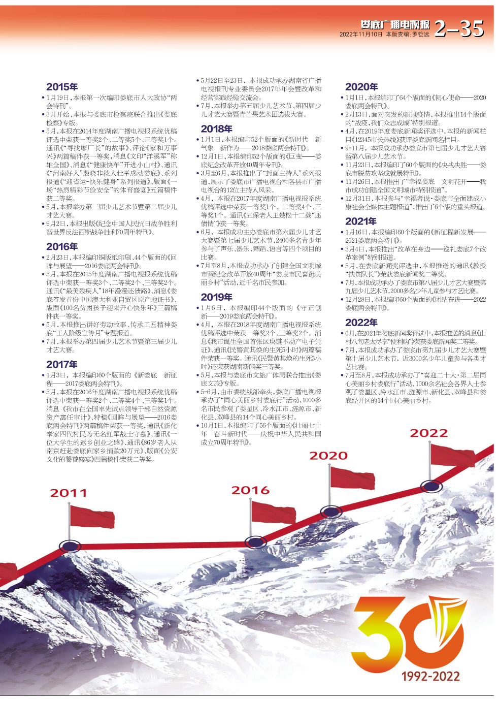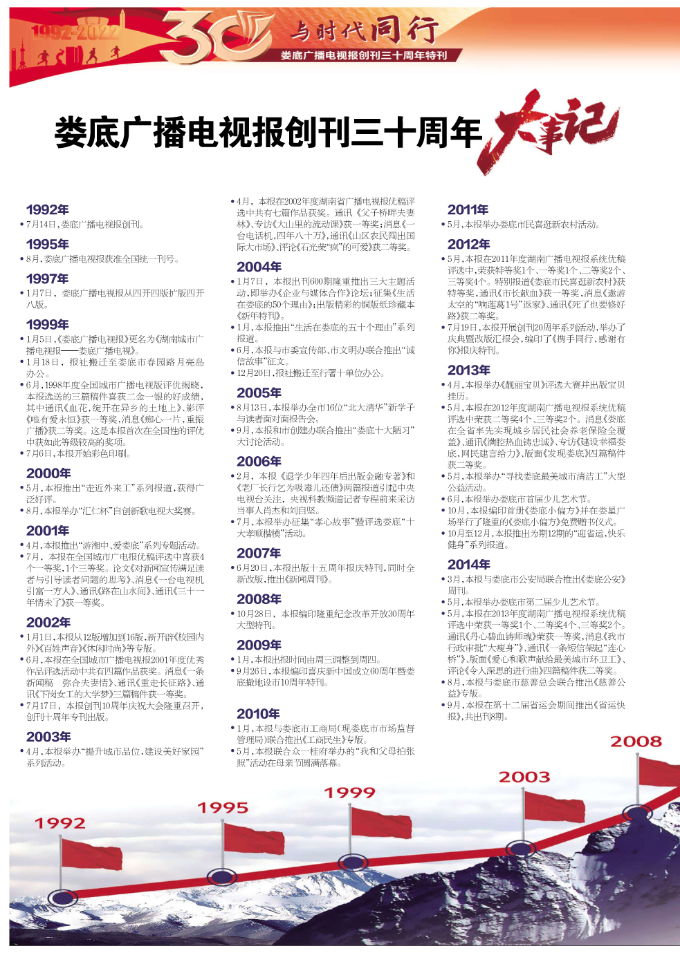 “天行健,君子以自强不息。”30年,1500余期报纸,10950多个日日夜夜,我们一步一个脚印,勇攀高峰。1995年8月,娄底广播电视报获准全国统一刊号;1997年1月7日,娄底广播电视报从四开四版扩版四开八版;1999年1月5日,《娄底广播电视报》更名为《湖南城市广播电视报——娄底广播电视》;1999年7月6日,娄底广播电视报开始彩色印刷。