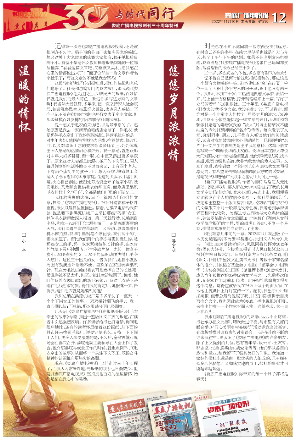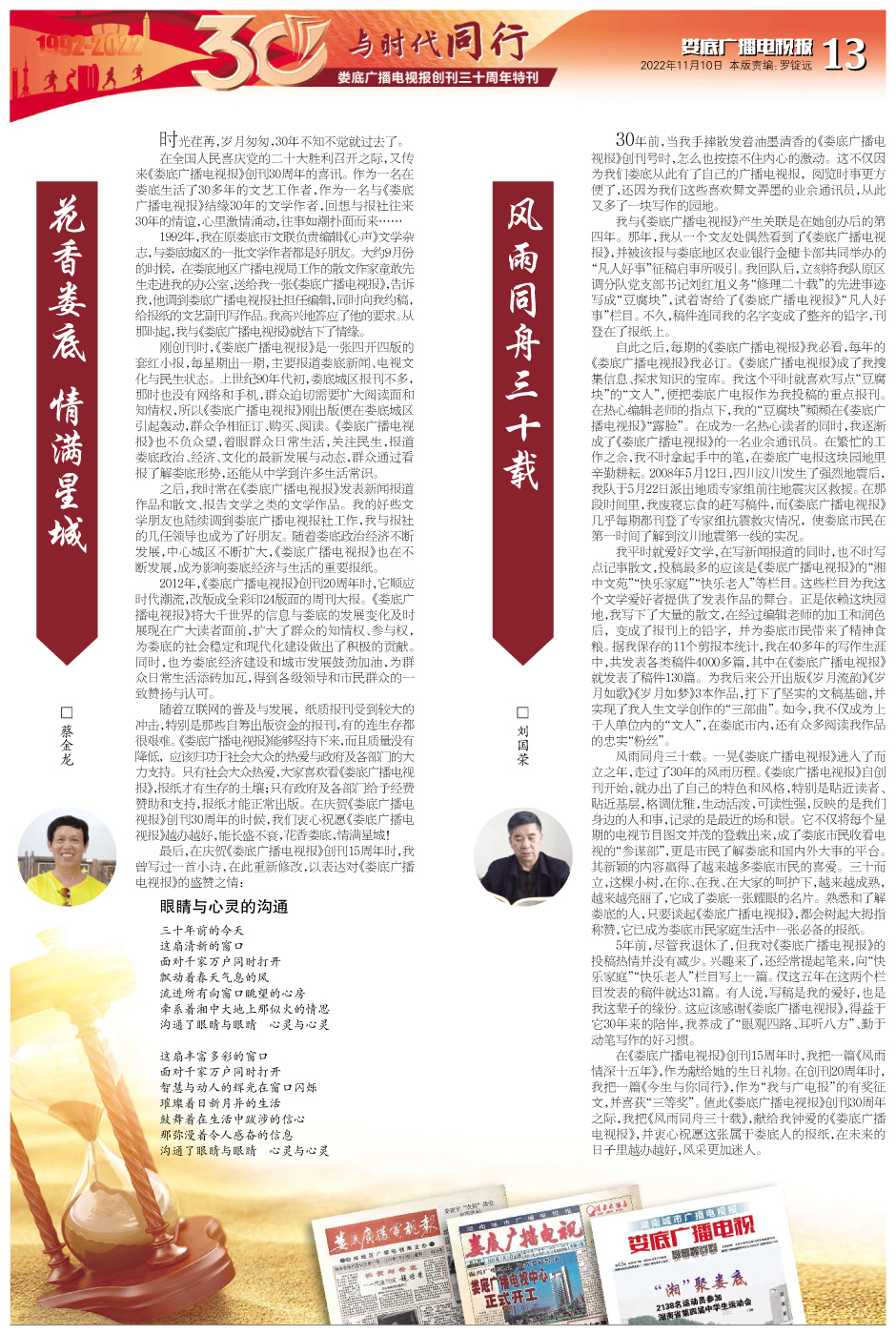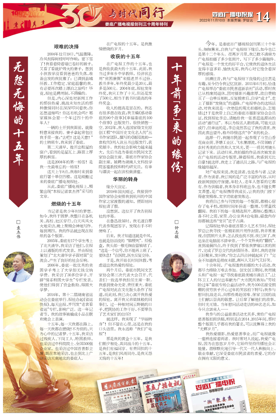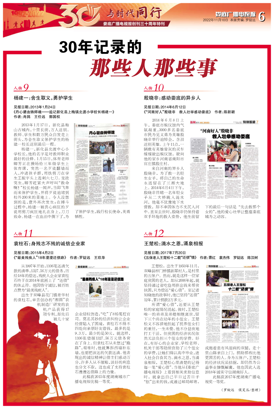 “天行健,君子以自强不息。”30年,1500余期报纸,10950多个日日夜夜,我们一步一个脚印,勇攀高峰。1995年8月,娄底广播电视报获准全国统一刊号;1997年1月7日,娄底广播电视报从四开四版扩版四开八版;1999年1月5日,《娄底广播电视报》更名为《湖南城市广播电视报——娄底广播电视》;1999年7月6日,娄底广播电视报开始彩色印刷。