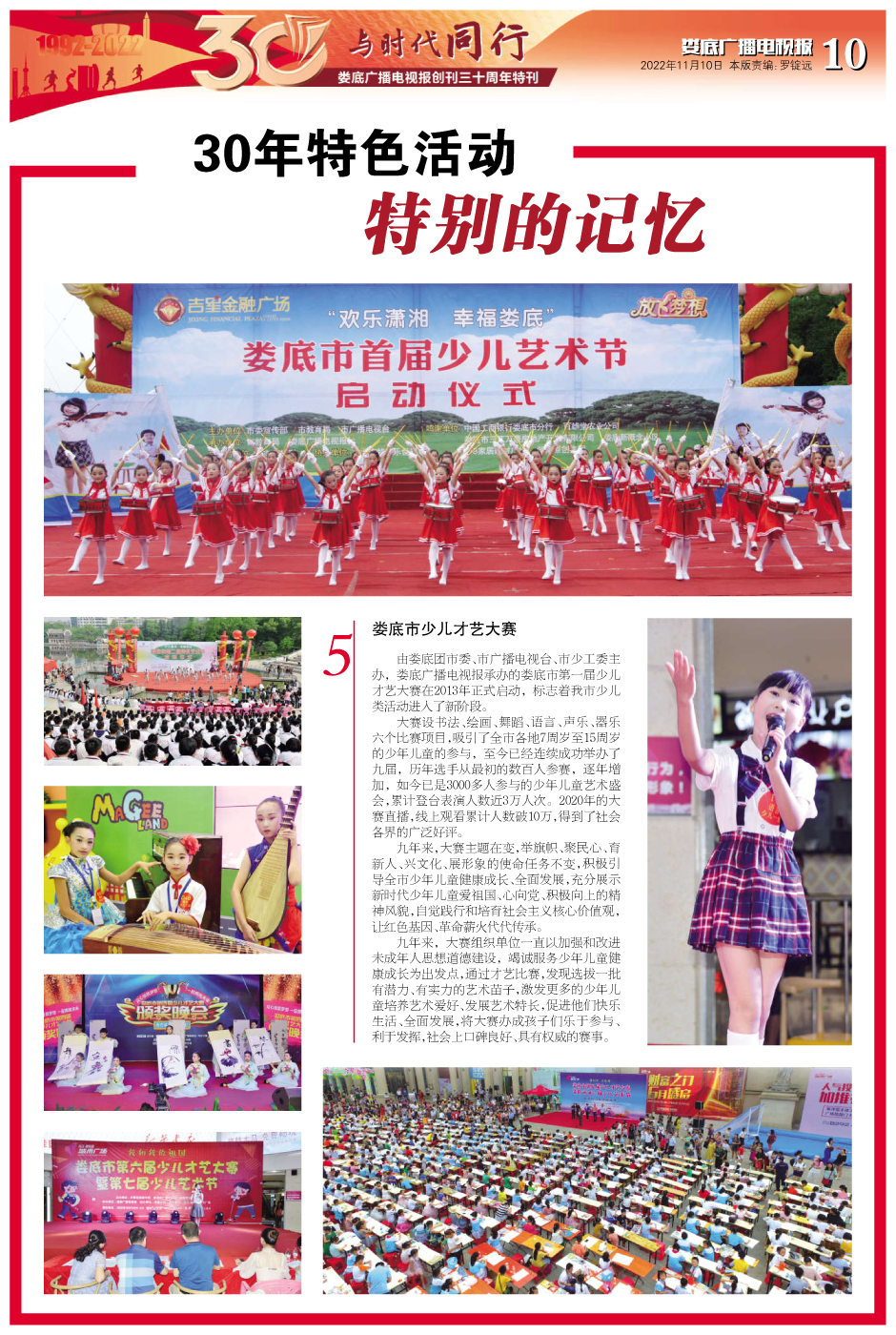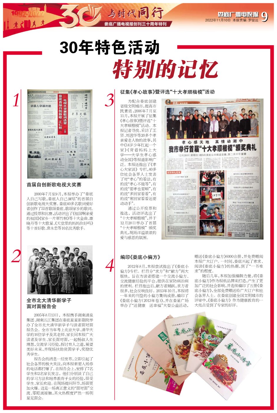 30年来,我们活动精彩纷呈,连续9年承办娄底市少儿才艺大赛和少儿艺术节,连续三届承办“同心美丽乡村娄底行”活动,这聚焦了社会热点,弘扬了主旋律;连续7年的《两会特刊》,围绕中心,服务大局,受到了各级各单位的好评;连续编印了5册《娄底小偏方》,打造出了娄底人耳熟能详的品牌。