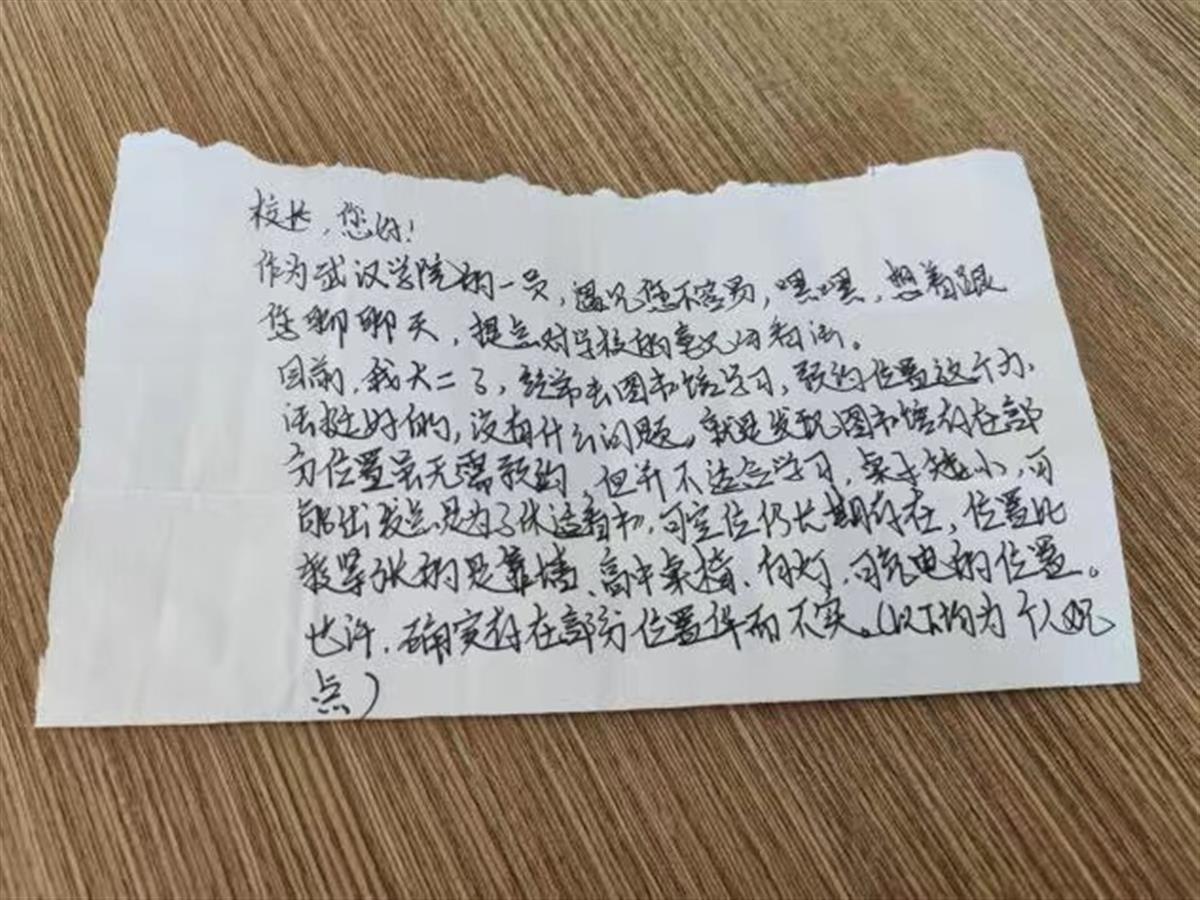 “校长,您好!作为武汉学院的一员……想着跟您聊聊天,提点对学校的意见和看法。”11月7日,武汉学院校长李忠云在中央教学楼三号楼《马克思主义基本原理》课堂听课,一名大二学生递来一张小纸条,谈了图书馆自习座位紧张的问题。第二天,学校管理团队到图书馆实地调研,现场办公,商定增加自习座位方案。