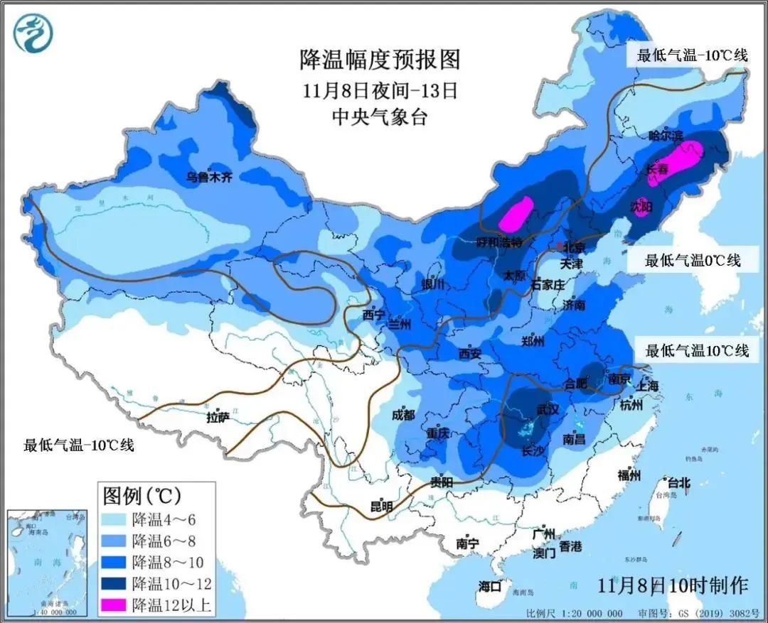 11月8日夜间至13日全国降温幅度预报图。来源:中央气象台