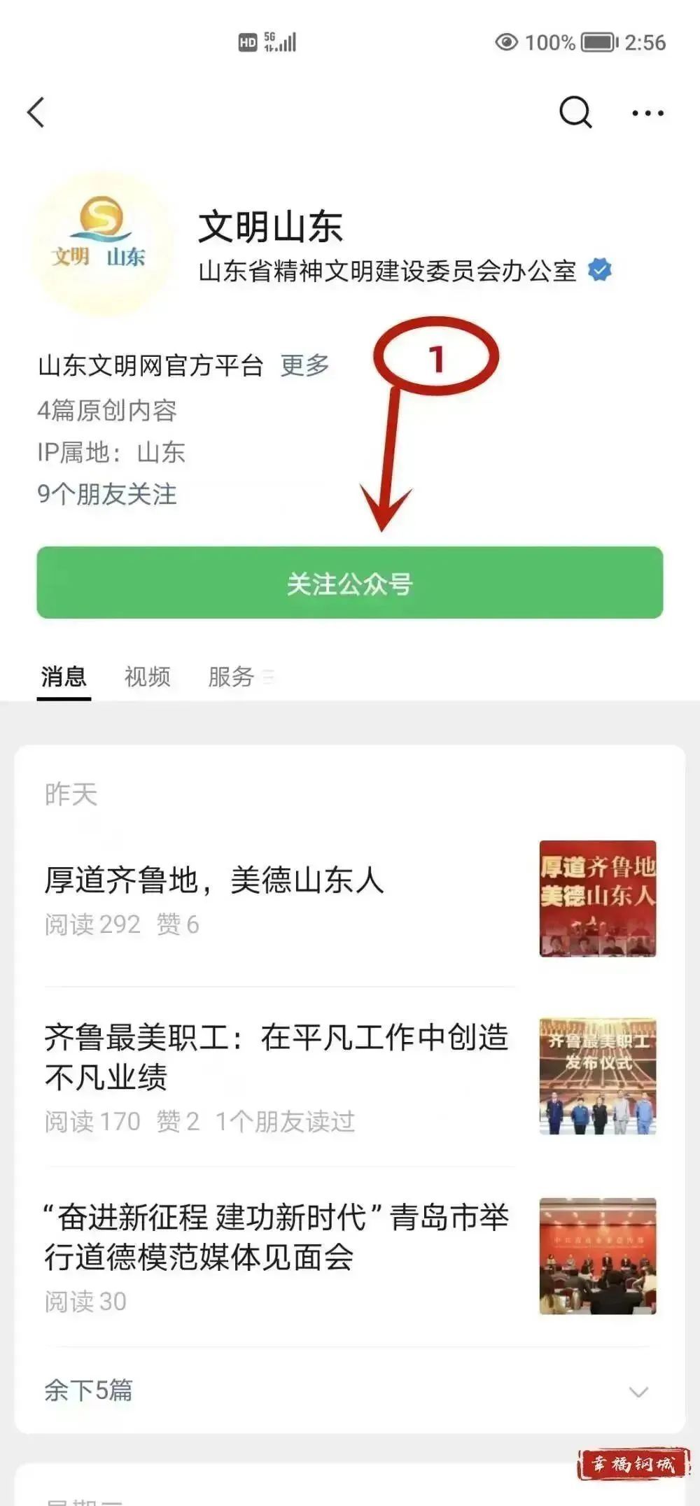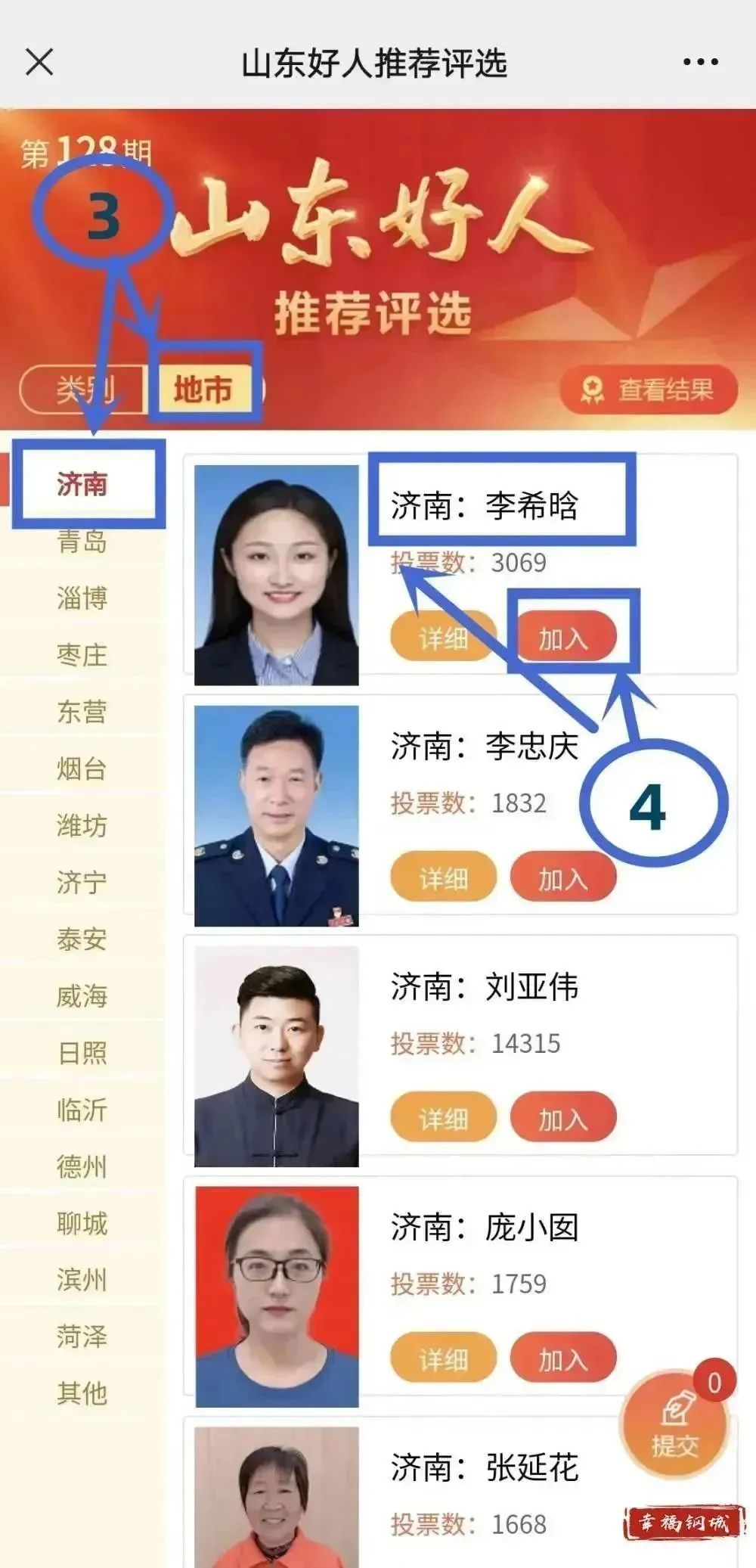 方式二:微信搜索并关注“文明山东”公众号,任务栏点击“山东好人”,点击“地市”,选择济南,选择“加入”进行投票。