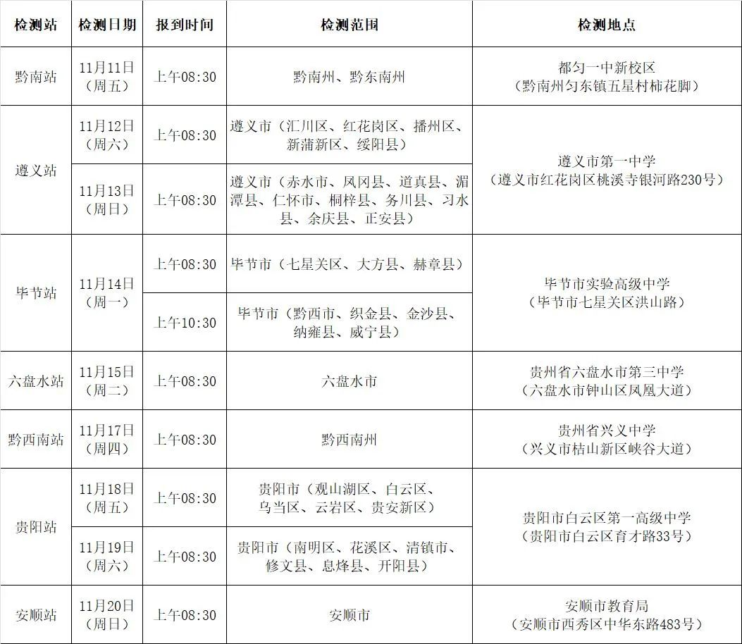根据2023年度空军招飞工作安排,2022年11月11日至11月20日,空军招飞局成都选拔中心将派初选检测组赴贵州省各地市组织初选检测,铜仁市初选检测工作因受疫情影响另行通知,请及时关注学校或空军西南招飞微信公众号通知。具体安排如下: