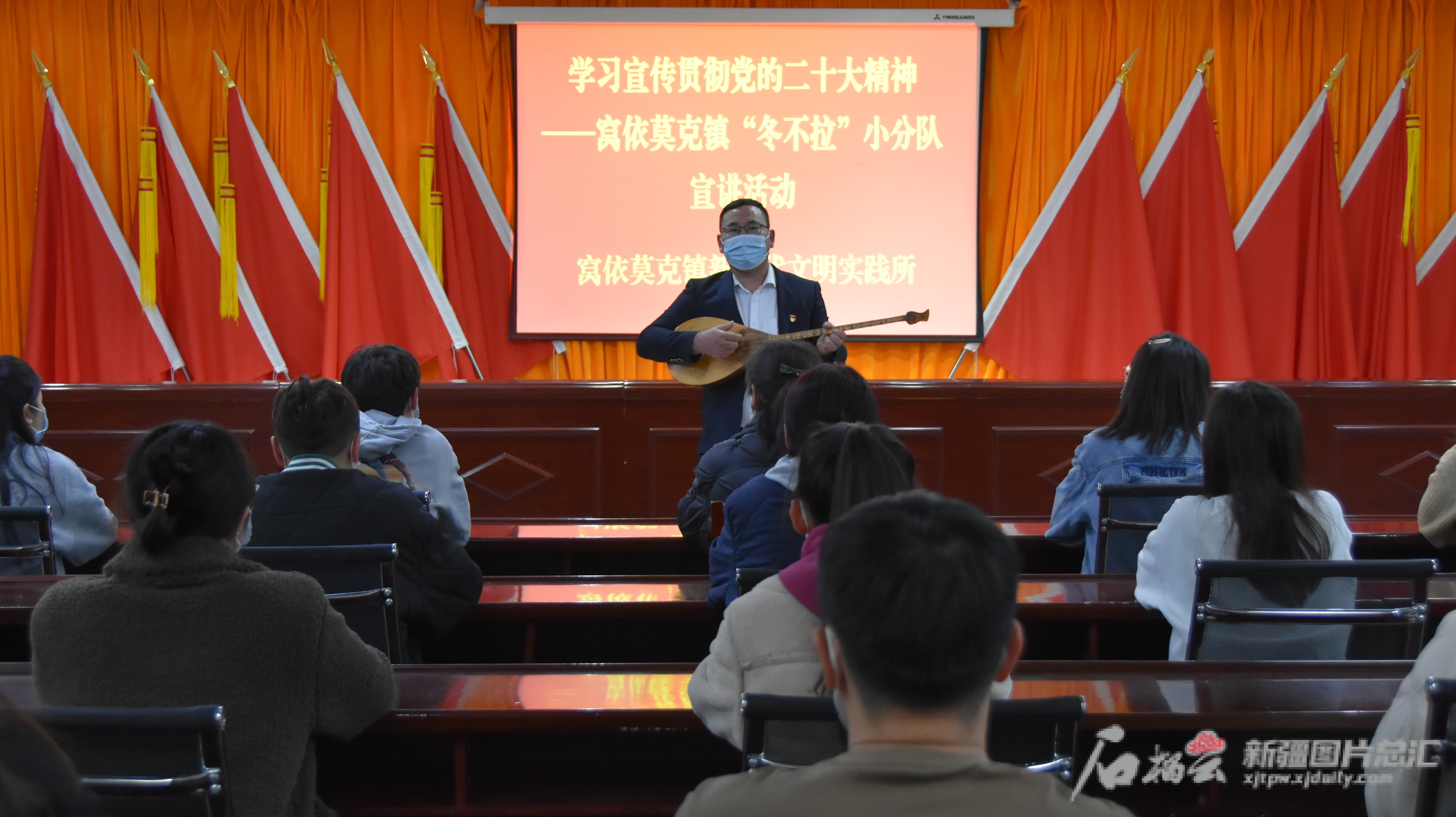 10月28日,布尔津县窝依莫克镇新时代文明实践所里,传出欢快的冬不拉弹唱声,这里正在进行一场党的二十大精神宣讲。冬不拉小分队队员怀抱冬不拉,用歌声做特色宣讲,让在座的干部群众听得津津有味。