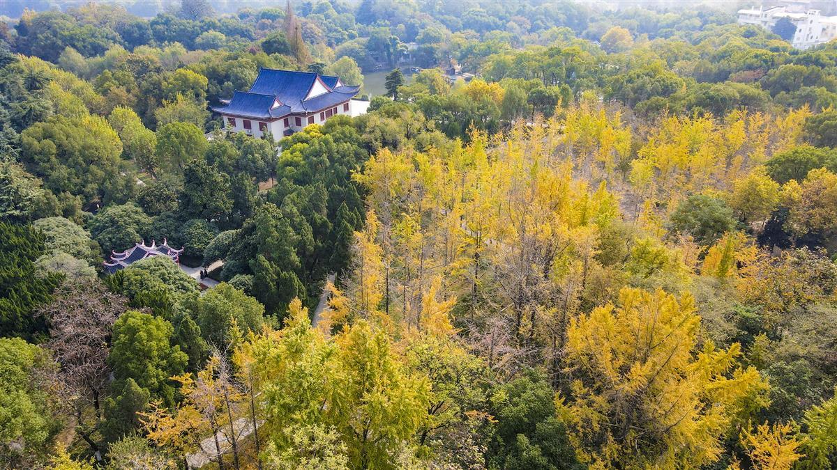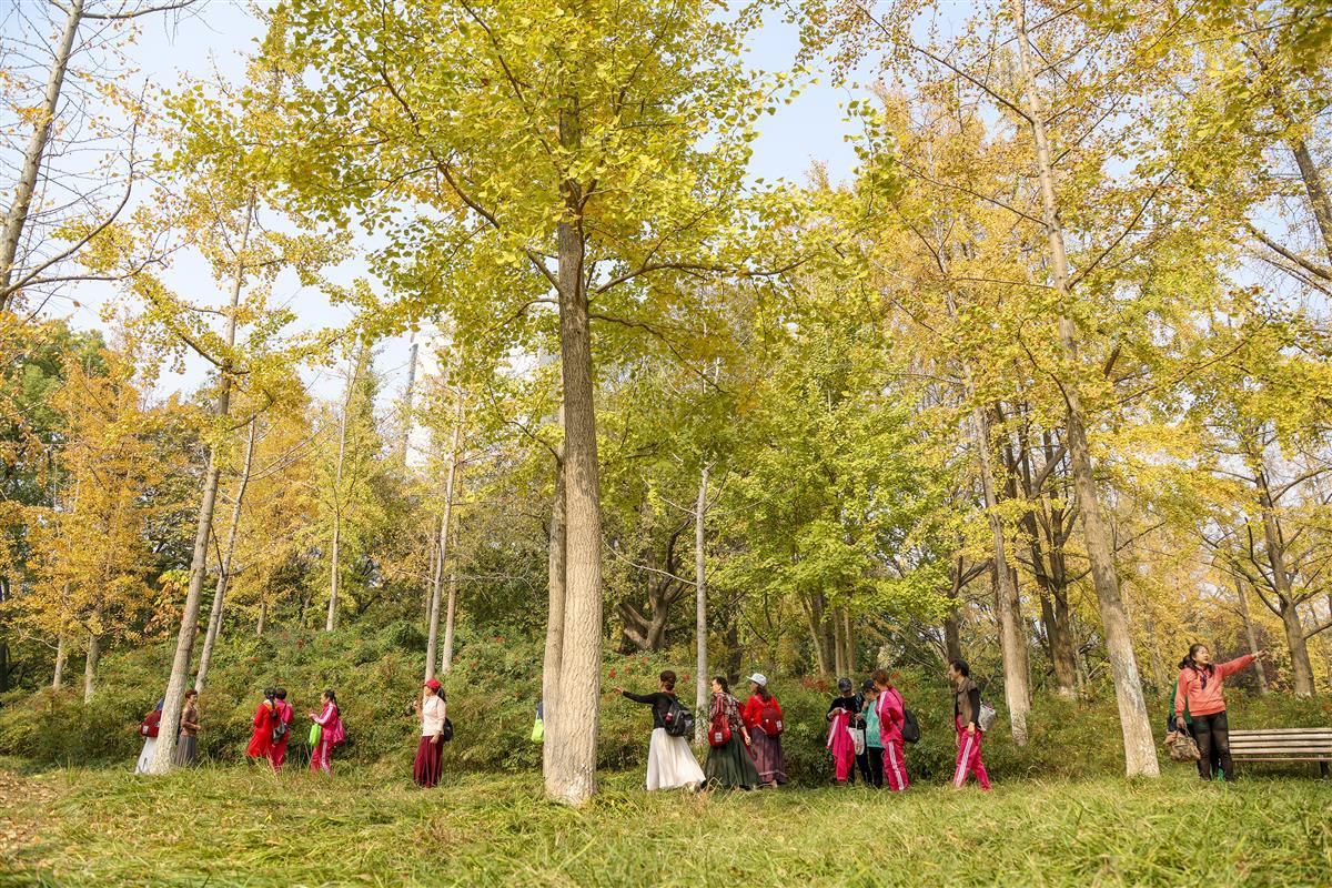 11月9日,荆州市沙市中山公园中山纪念堂西侧银杏林,树木高大挺拔,树型优美,错落有致,吸引不少市民游玩赏景。