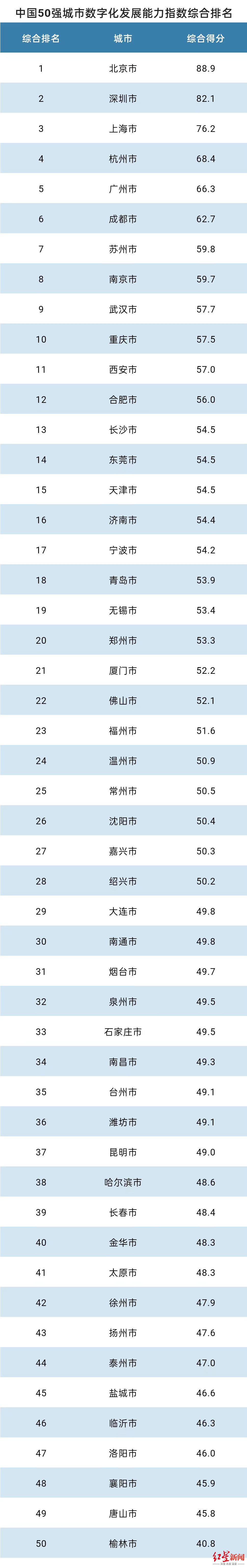 ▲中国50强城市数字化发展能力指数综合排名表 图据成都市经信局官方微信