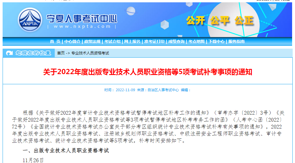 11月9日,宁夏人事考试中心发布消息,2022年出版专业技术人员职业资格考试、注册城乡规划师职业资格考试、中级注册安全工程师职业资格考试、审计专业技术资格考试、统计专业技术资格考试的补考时间安排出炉,具体如下