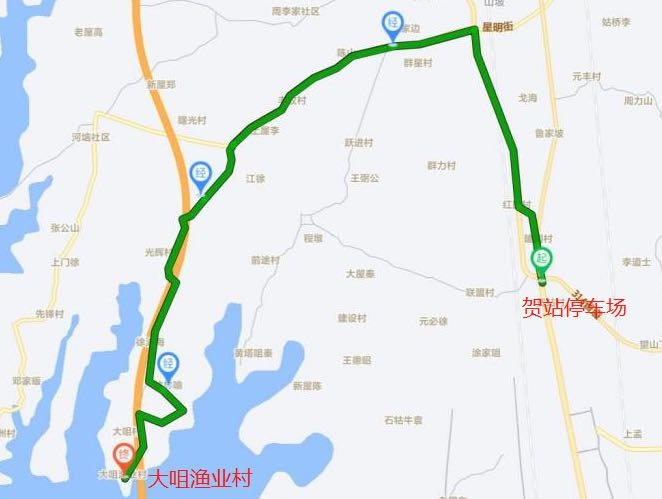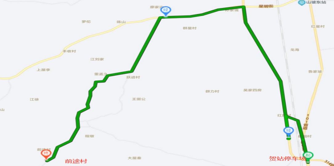 停靠站点:贺站停车场、陈春湾、联盟村、建设村、郝边秦、郑家边、前途村。(7站)