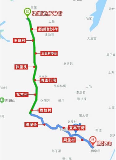 停靠站点:梁湖路舒安街、梁湖路舒安小学、梁湖路八秀村、王班村委会、韩贡如、周孟行湾、瓦窑村、中门雷湾、贡如村、细屋徐、熊下阿里湾、夏亦可湾、韩英周湾、嗣孟村村委会、熊嗣孟湾、熊汉山湾。(16站)