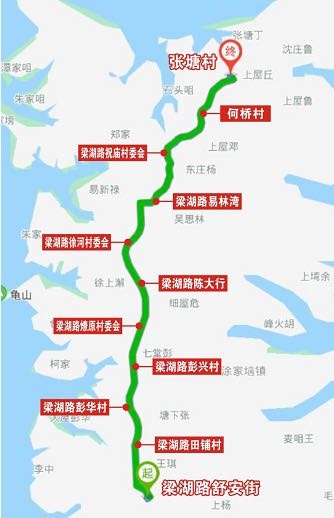 停靠站点:梁湖路舒安街、梁湖路田铺村、梁湖路彭华村、梁湖路彭兴村、梁湖路燎原村委会、梁湖路陈大行、梁湖路徐河村委会、梁湖路易林湾、梁湖路祝庙村委会、祝王湾、徐让、何桥村村委会、老屋何桥王湾、冯金湾、石头咀、熊家村、张塘村村委会。(17站)