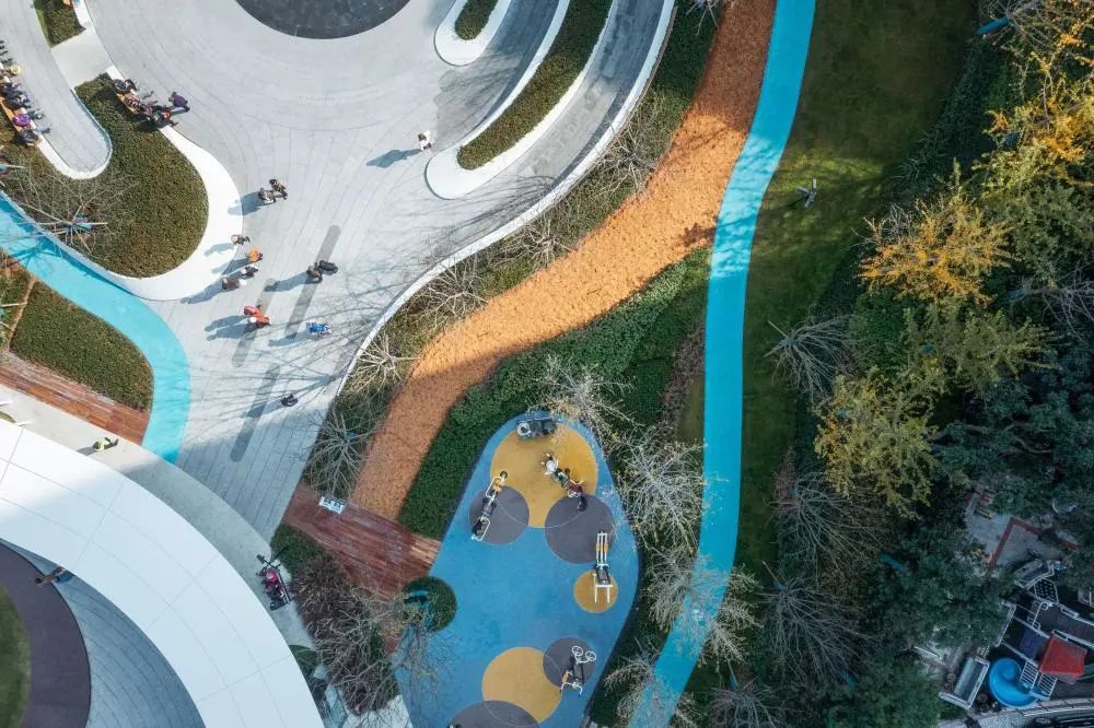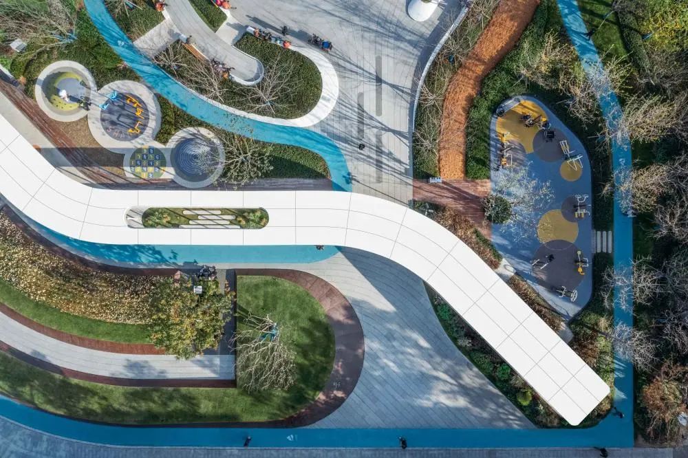 比如浅蓝色跑道,并非简单环绕绿地一圈,而是一个“乐”字形。它斜穿廊架下方,绕弯后抵达花坛边缘,再进入喷泉池后方。这样弯曲的跑道不仅一步一景,妙趣横生,拉长了动线,而且它本身也是各功能区的视觉分界线。