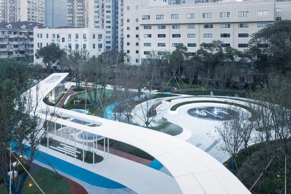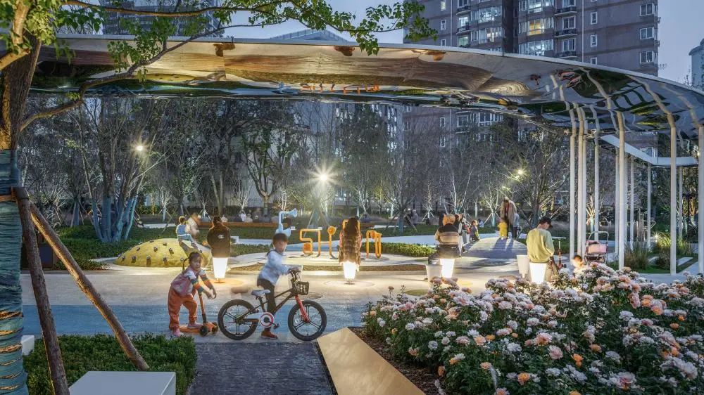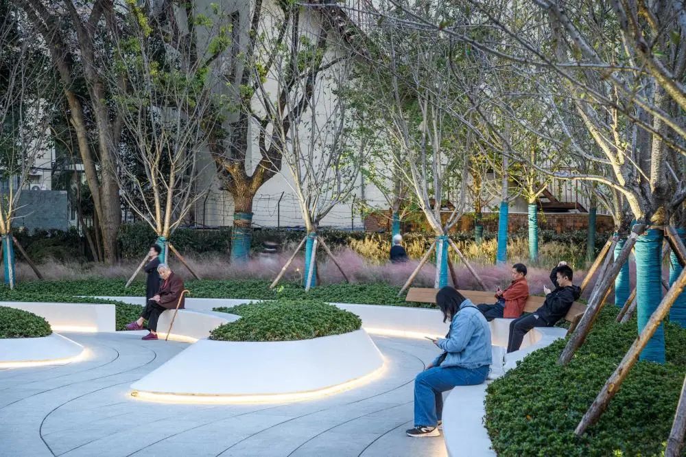 通过可坐、可玩的白色艺术混凝土坐凳与绿化景观融合,激发趣味活动;通过可发光的重力感应坐凳,为儿童趣乐空间提供惊喜;通过下凹5毫米的场地设计,为中心音乐旱喷提供更丰富的延时体验,让喷泉落幕后的水镜成为孩子们的下一个“自然玩具”;通过传统的步移景异,让每个使用者都能找到属于自己的角落。