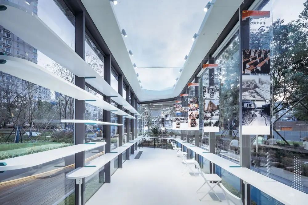 站在街角望去,全长80米的架高玻璃廊道十分吸引眼球。廊下空间为市民提供了遮阳避雨之所,也整合了两间绿地管理用房,让它们显得美观。