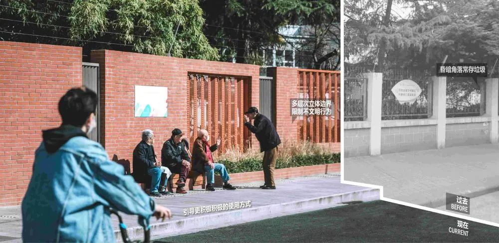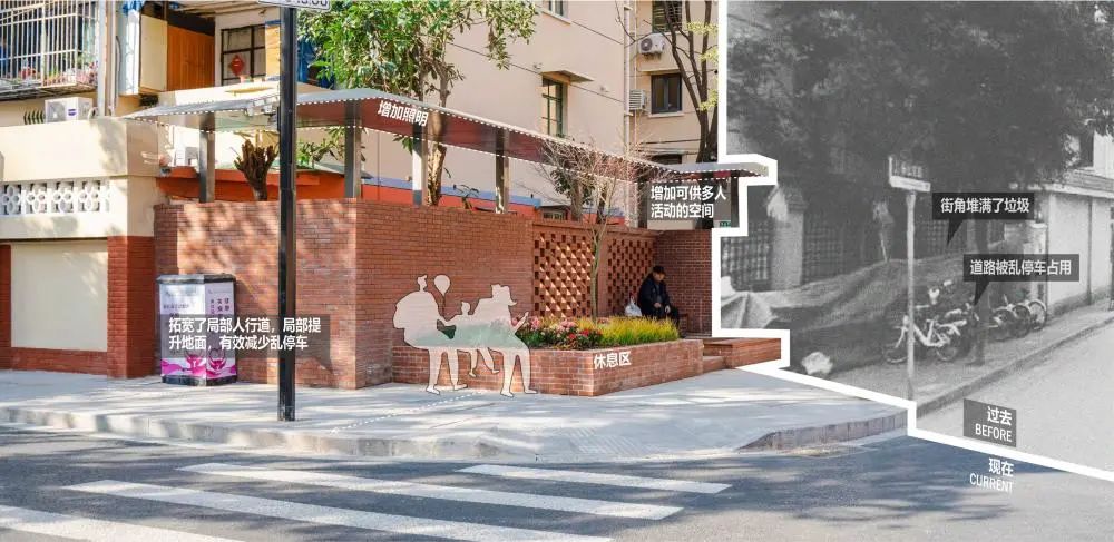 设计团队还在设计后的围墙上加设立体雨檐,加装照明灯。局部围墙呈现凹凸变化,既可以临时停自行车,又方便通行。运用同样的手法,设计团队重新打开与塑造了多个转角街口景观,将原先消极的角落转变为公共交流的场所,让人们随时随地可以在转角停留、漫步,和熟人道上几句家常。