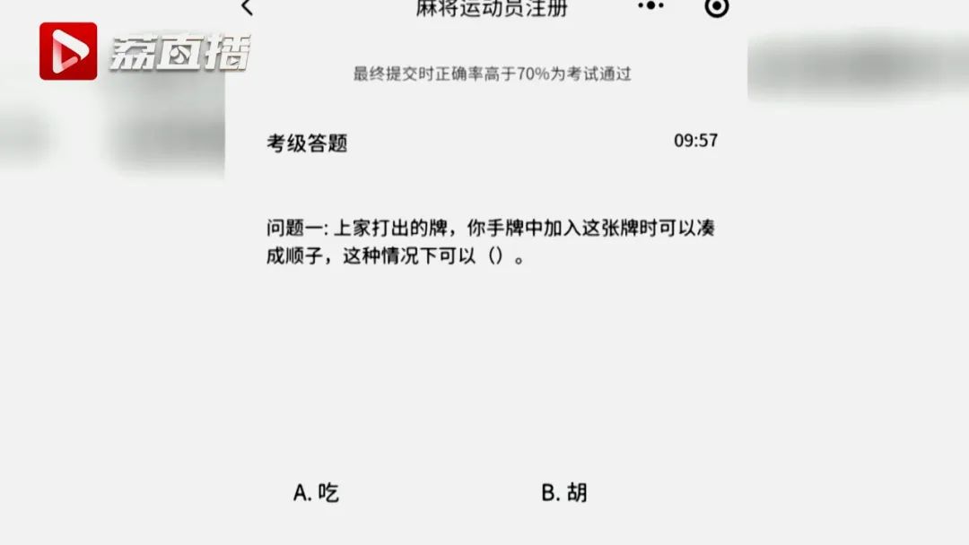 想要注册麻将专业运动员,首先需要进入微信小程序“智力运动考级”中,虽然注册运动员的题目很简单,但麻将等级评定并不容易,涉及大量规则考查。