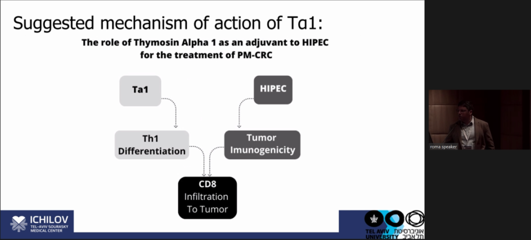 腹腔热灌注化疗(HIPEC)是治疗结肠癌腹膜转移(PM-CRC)的有效方法,但是患者仍然有较高的复发风险。来自Tel-Aviv University的Eran Nizri教授分享了胸腺肽α1辅助HIPEC在PM-CRC模型中的作用。研究发现,胸腺肽α1通过诱导Th1抗肿瘤免疫应答,增强了HIPEC在PM-CRC治疗中的作用。