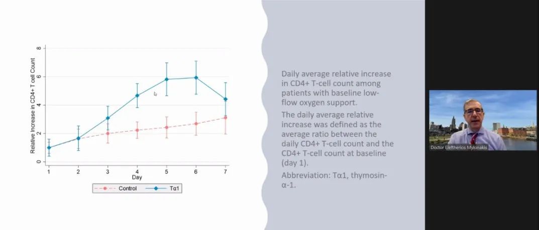 研究发现,淋巴细胞减少症和细胞因子风暴与COVID-19患者不良临床结局有关,如何对这些患者进行免疫调节治疗是临床医生面临的重大挑战。来自Warren Alpert Medical School of Brown University的Eleftherios Mylonakis教授分享了在COVID-19感染所致低氧血症和淋巴细胞减少症的患者中,胸腺肽α1对淋巴细胞减少症的逆转作用,证实胸腺肽α1可提高7天内淋巴细胞减少症的恢复率。