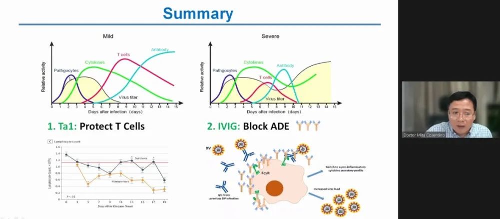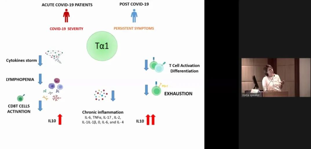 来自University of Rome Tor Vergata的Antonella Minutolo教授则分享了胸腺肽α1在减轻COVID-19炎症风暴中的作用。研究发现胸腺肽α1可以减少细胞因子表达,抑制CD8+T细胞活化,提示胸腺肽α1可能有助于减轻COVID-19的炎症风暴风险。