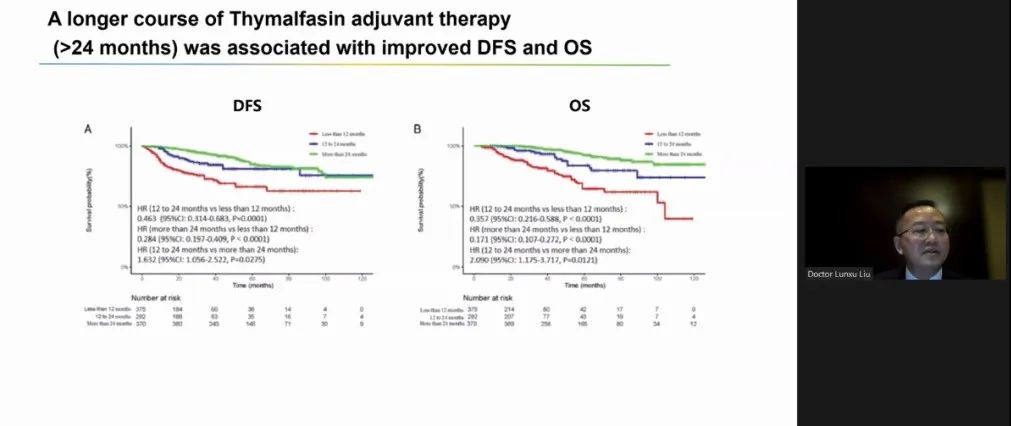 来自四川大学华西医院的刘伦旭教授分享了非小细胞肺癌(NSCLC)患者R0切除后辅助免疫治疗进展。一项大样本、长期随访的回顾性研究(TITLE)显示,对于接受根治性切除术的IA-IIIA期NSCLC患者,胸腺肽α1术后辅助治疗可显著改善IA-IIIA期NSCLC患者。