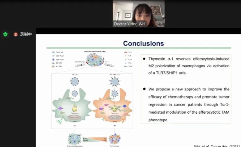肿瘤微环境相关巨噬细胞具有M1和M2两种表型,分别是促炎的M1表型和抗炎、促修复的M2表型,M1型巨噬细胞具有较强的肿瘤杀伤能力,M2型多分泌抑炎因子,促进组织修复。来自东南大学病原生物学与免疫学系的韦逸婷博士介绍了胸腺肽α1协同化疗抗击肿瘤的生物学效应及作用机制。研究显示,胸腺肽α1能够通过激活TLR7/SHIP1轴,重编程M2型肿瘤微环境巨噬细胞向M1型转化,进而提高肿瘤浸润淋巴细胞数量与功能,显著提升化疗疗效。该研究结果为胸腺法新协同化疗和/或PD-1/PD-L1抗击肿瘤的临床应用奠定了充分的基础。