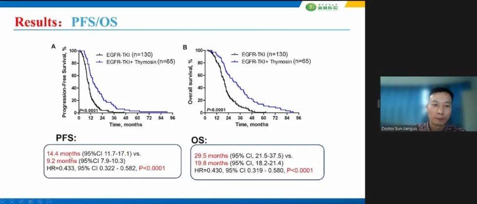 来自陆军军医大学新桥医院的孙建国教授报告了评估EGFR-TKI联合胸腺肽对比EGFR-TKI单药治疗EGFR突变晚期NSCLC的疗效和安全性的回顾性研究结果,与EGFR-TKI单药治疗相比,EGFR-TKI联合胸腺肽可显著延长EGFR敏感突变晚期NSCLC患者的PFS和OS,且无额外不良反应。