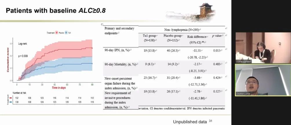 来自南京大学的柯路教授分享了胸腺肽α1在预防急性坏死性胰腺炎(ANP)后感染性胰腺坏死(IPN)中的作用。一项多中心、随机、安慰剂对照研究(TRACE)表明,胸腺肽α1可能降低绝对淋巴细胞计数(ALC)≥0.8x109/L的ANP患者90天IPN的发生率(vs 安慰剂组,P=0.015)。
