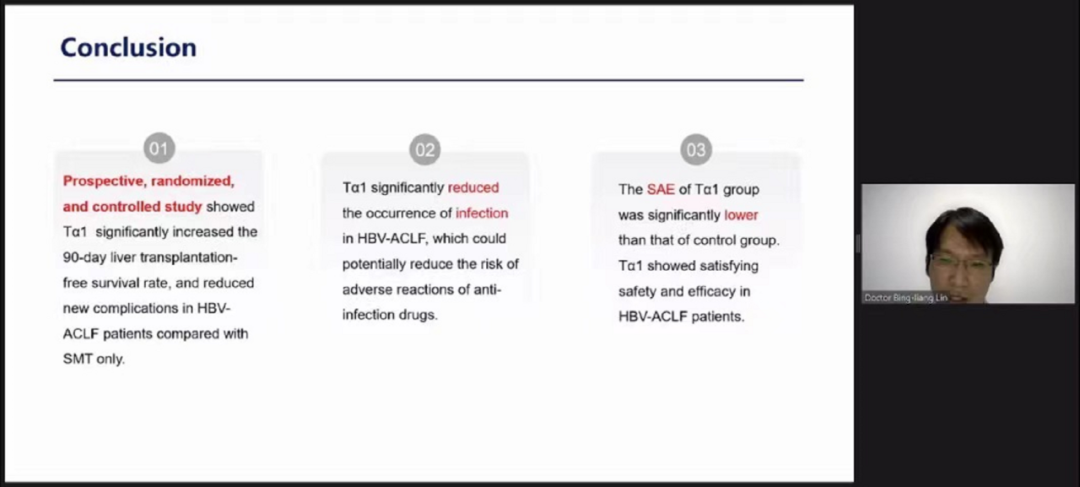 来自中山大学附属第三医院的陈俊峰教授讲解了林炳亮教授团队的一项探索胸腺肽α1联合常规治疗对HBV相关慢加急性肝衰竭(HBV-ACLF)的有效性和安全性的前瞻性随机对照研究。研究结果显示,胸腺肽α1显著提升HBV-ACLF患者90天无肝移植累积存活率(75% vs 53.4%,P=0.03),并降低ACLF并发症,尤其新发感染和肝性脑病。胸腺肽α1显著降低感染发生,有利于降低ACLF患者住院期间继发感染的发生风险,同时避免抗感染药物的副作用,提示胸腺肽α1可以延缓ACLF的重症化。而且胸腺肽α1治疗不良反应少,不额外增加患者治疗风险。这一高级别的循证证据提升了胸腺肽α1在HBV-ACLF中的用药地位。