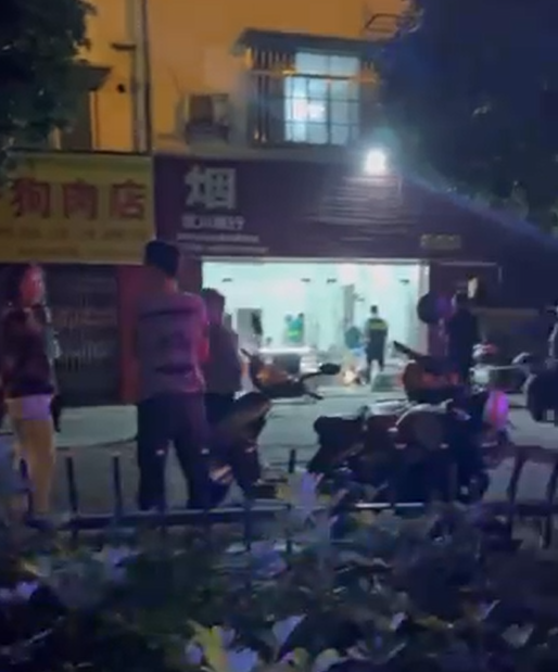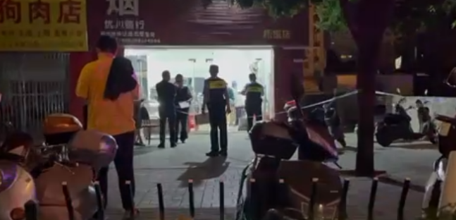 多段视频显示,事发地点旁边是一家狗肉店,糖烟店内有一名伤者躺在地上,有警车停在附近,民警在现场进行处置,附近拉起警戒线,不久伤者被从店内抬出。