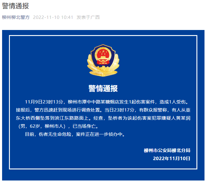 11月10日,柳州市公安局柳北分局通报:9日23时13分潭中中路某糖烟店发生1起伤害案件,造成1人受伤,该起伤害案犯罪嫌疑人黄某润(男,62岁,柳州市人)坠桥,已当场身亡。