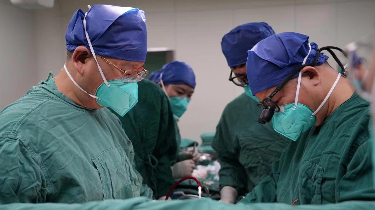 董念国教授、夏家红教授、王国华副教授正在进行第二台心脏移植手术。通讯员刘坤维 陈有为 摄