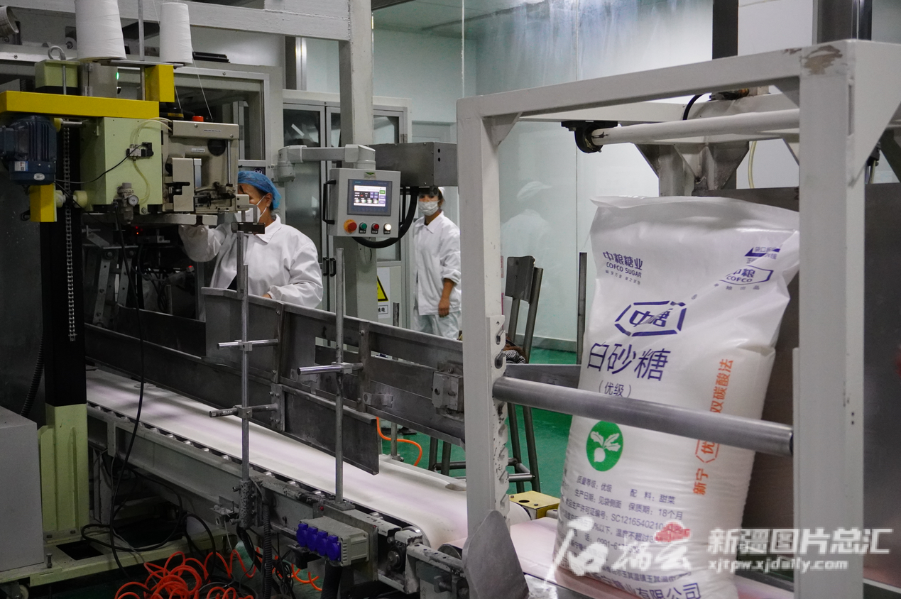 中粮屯河伊犁新宁糖业有限公司白砂糖包装车间,员工正在检查设备。石榴云/新疆日报记者巴莎· 铁格斯摄