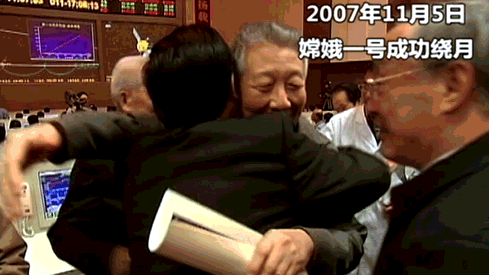(2007年11月5日,嫦娥一号成功绕月后,欧阳自远与孙家栋相拥而泣,旁边两位白发老人分别是栾恩杰和时任探月工程副总设计师龙乐豪,素材来源@纪录片《我们的征途》)