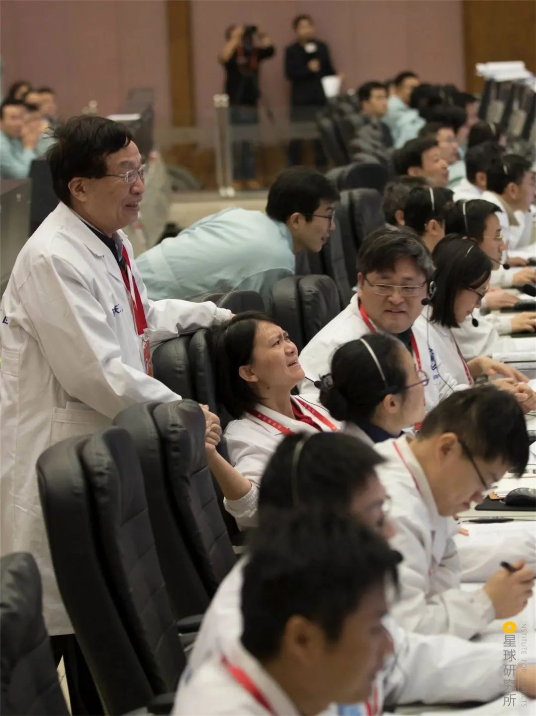 (2019年1月3日,嫦娥四号成功落月后,74岁的嫦娥一号卫星总设计师兼总指挥叶培建院士(左一)与嫦娥四号探测器项目执行总监张熇(左二),两代“嫦娥人”的手,紧紧地握在了一起,摄影师@新华社记者金立旺)