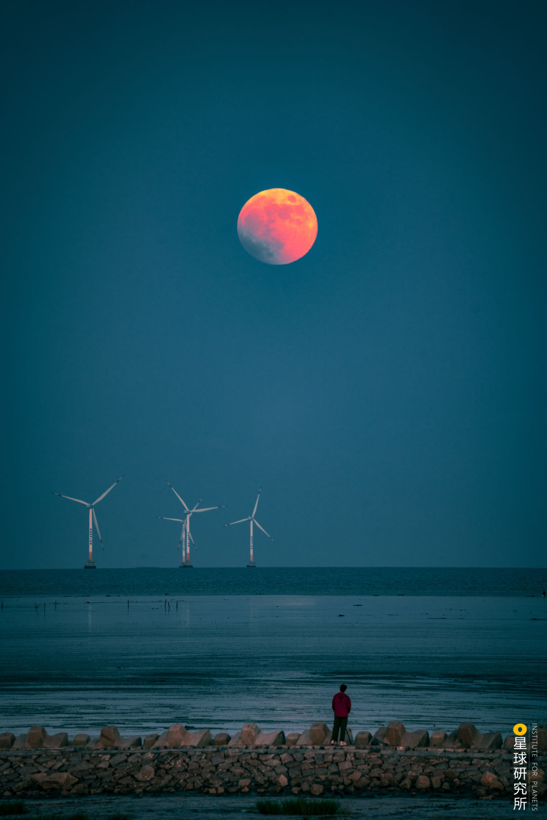 (2022年11月8日,人们在上海临港欣赏月全食,图中为月全食的初亏阶段,摄影师@李俊杰)