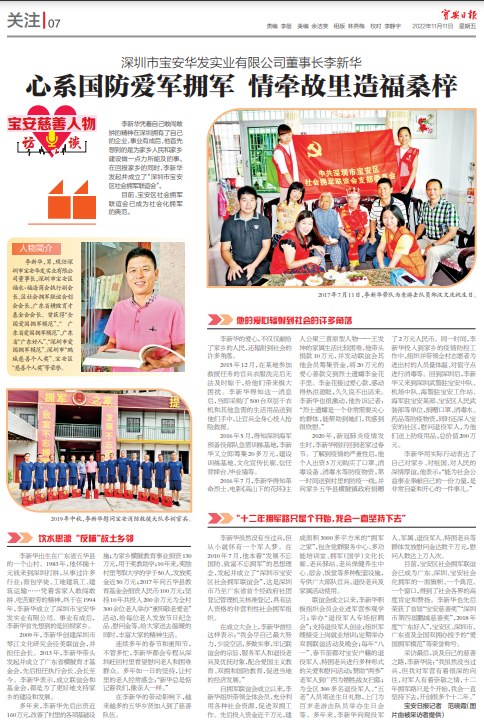 李新华凭着自己敢闯敢拼的精神在深圳拥有了自己的企业,事业有成后,他首先想到的是为家乡人民和家乡建设做一点力所能及的事。在回报家乡的同时,李新华发起并成立了“深圳市宝安区社会拥军联谊会”。