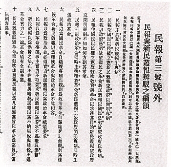 1905年11月,中国同盟会创办《民报》作为机关报。孙中山亲撰发刊词,把同盟会的纲领概括为“民族、民权、民生”,合称“三民主义”。此系孙中山首次系统地提出三民主义思想理论。