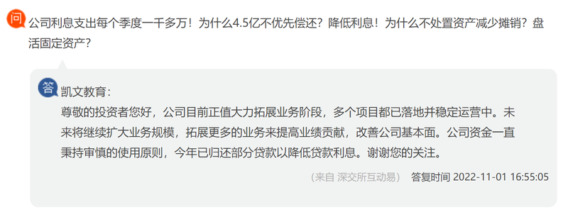 值得注意的是,凯文教育前三季度利息费用达4033.28万元,上年同期则高达4971.89万元,而截至2022年9月30日,凯文教育手中现金余额达4.53亿元。连年亏损,利息费用却一直居高不下,手中现金又十分充裕。这引起了投资人的质疑,询问公司有4.5亿现金,为何不优先偿还以降低利息,或处置资产减少摊销以盘活固定资产。