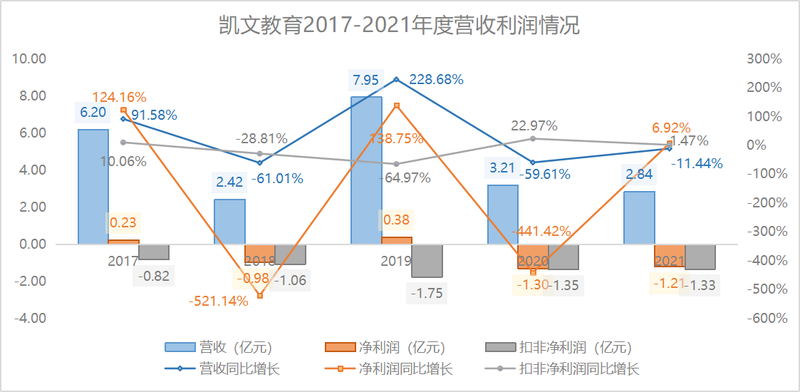 2021年9月起,凯文教育旗下北京海淀凯文学校和北京市朝阳区凯文学校不再纳入合并报表范围,其营收受到较大影响,2021年共计营收2.84亿元,同比减少11.44%;亏损1.21亿元。
