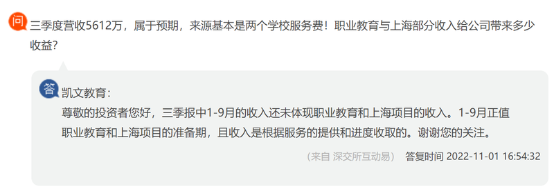 尽管转型动作如火如荼,仍投资人质疑三季报中还未体现职业教育的收入贡献。对于上述质疑,凯文教育方面表示,1-9月正值职业教育和上海项目的准备期,且收入是根据服务的提供和进度收取的,目前还未体现。