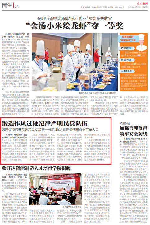 11月9日上午,光明区凤凰街道在凤凰大讲堂召开街道武装部党支部第一书记、政治教导员任职命令宣布大会。光明区人武部政委吴新征上校出席会议。凤凰街道武装部部长,社区民兵连长及街道应急排全体队员参加了会议。