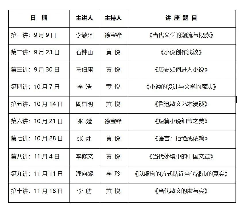 《中国作家公开课》以北京语言大学的校内通识课为基础,由我校教师联合百花文艺出版社《小说月报》,邀请中国当代有影响力的作家、批评家联合讲授,旨在引导大学生阅读当代经典,关怀中国社会,提升人文修养。