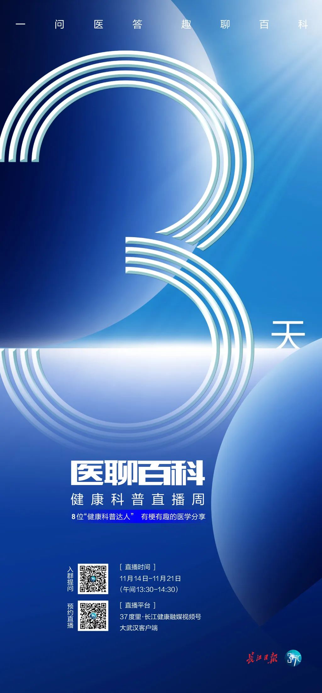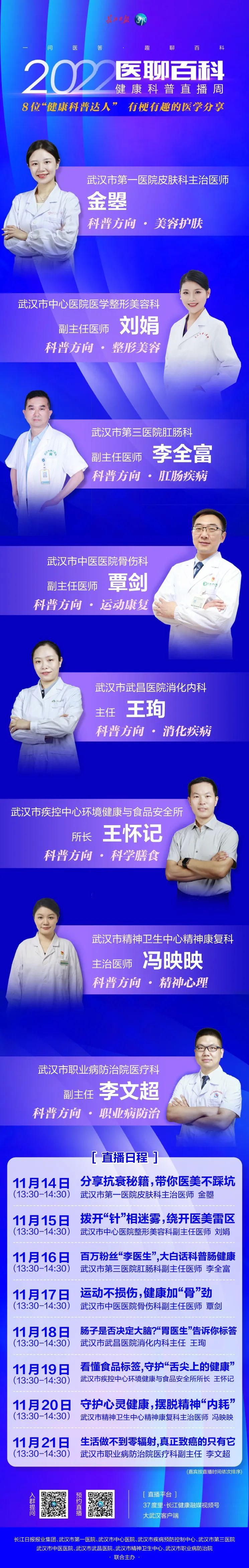 由长江日报报业集团联合武汉市第一医院、武汉市中心医院、武汉市疾控中心、武汉市第三医院、武汉市中医医院、武汉市武昌医院、武汉市精神卫生中心、武汉市职业病防治院主办的“医聊百科”公益系列直播,旨在为广大网友献上一场听得懂、记得住、用得上的“健康科普大餐”。