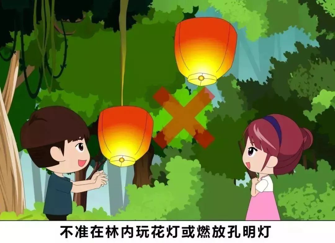 不准在林区里玩花灯或者燃放孔明灯,孔明灯虽然可以飞得很高很高,但是也很容易被林内的树枝拦下,从而引发可怕的森林大火!