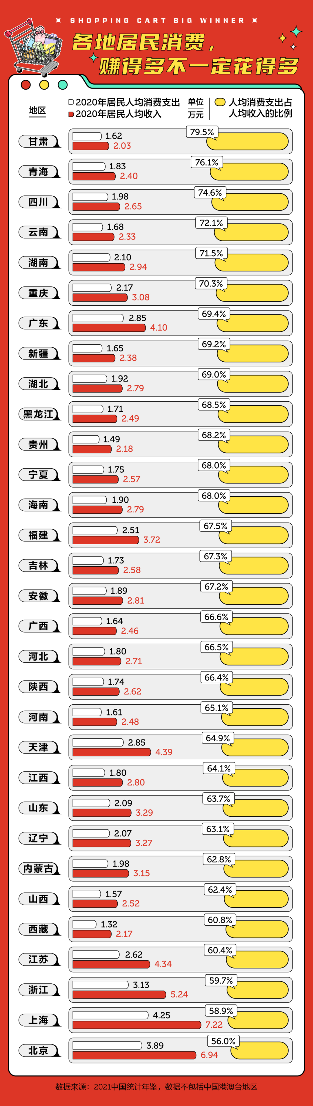 不过,收入和支出并不完全呈正相关。收入到达一定程度后,用于支出的比例反而会下降 [2]。比如北京、上海、浙江、江苏人的开销虽多,但支出占收入的比重却是全国最少的。